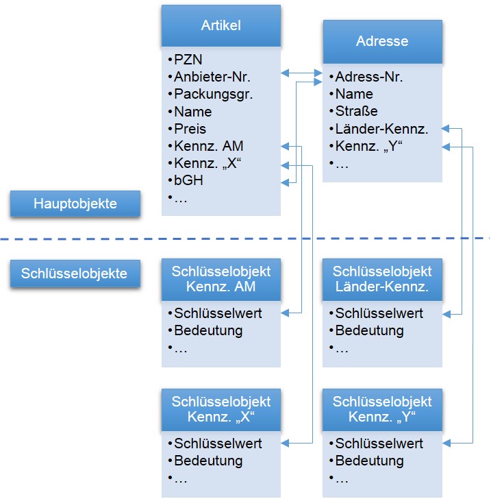 Dem Artikel sind eine Reihe von Attributen zugeordnet (z. B. Preise) sowie weitere mit den Artikeln verknüpfte Hauptobjekte (z. B. Adresse). Einige der Attribute werden als Schlüsselwerte abgebildet (z. B. verschiedene Kennzeichen für den Mehrwertsteuersatz), deren Bedeutung sich durch Schlüsselobjekte erschließt.